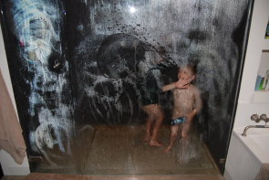 we lekker gespeeld. Oby is met zijn kleren aan onder de douche